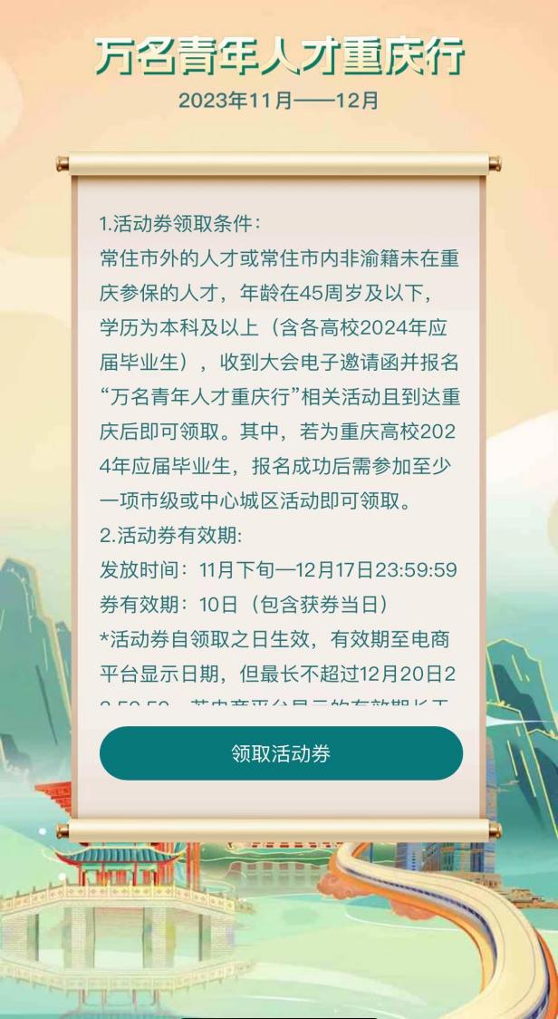本次活动面向年龄在45周岁及以下、学历为本科及以上(含各高校2024年应届毕业生),常住市内外、国(境)外的非渝籍或常住市外、国(境)外的渝籍(未在重庆参加社保)人才开展,通过国才会官方网站(https:/www.cqycdh.com/)“万名青年人才重庆行”专区或手机搜索“重庆国际人才交流大会服务”微信小程序报名获取专属电子邀请函。