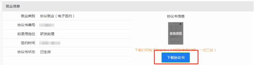2.签约完成后,系统会生成电子协议书,学生和用人单位下载打印协议书。点击“查看详情”,进入签约信息界面,下载打印协议书(一式四份),交用人单位盖章。
