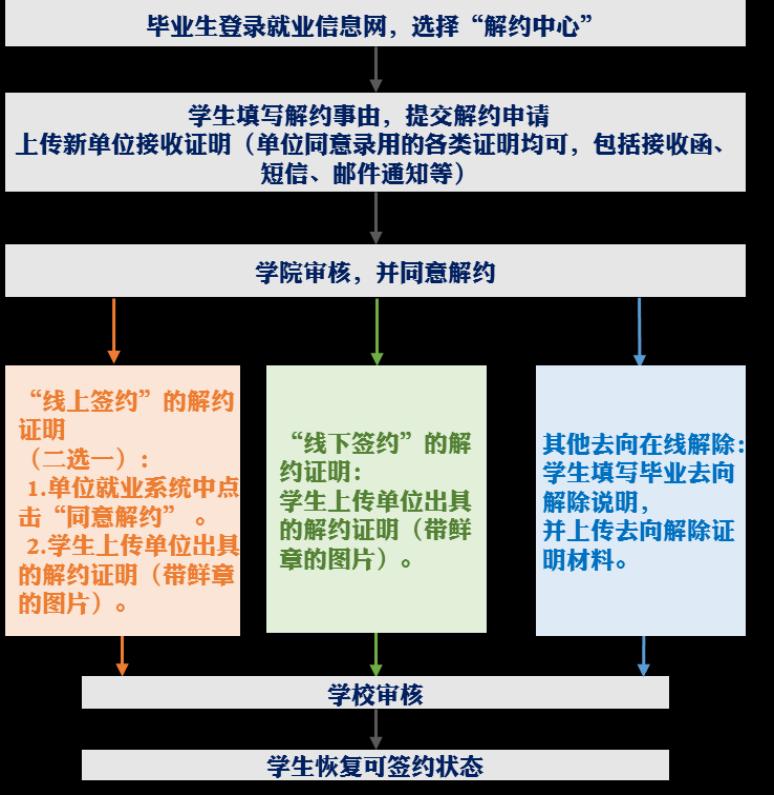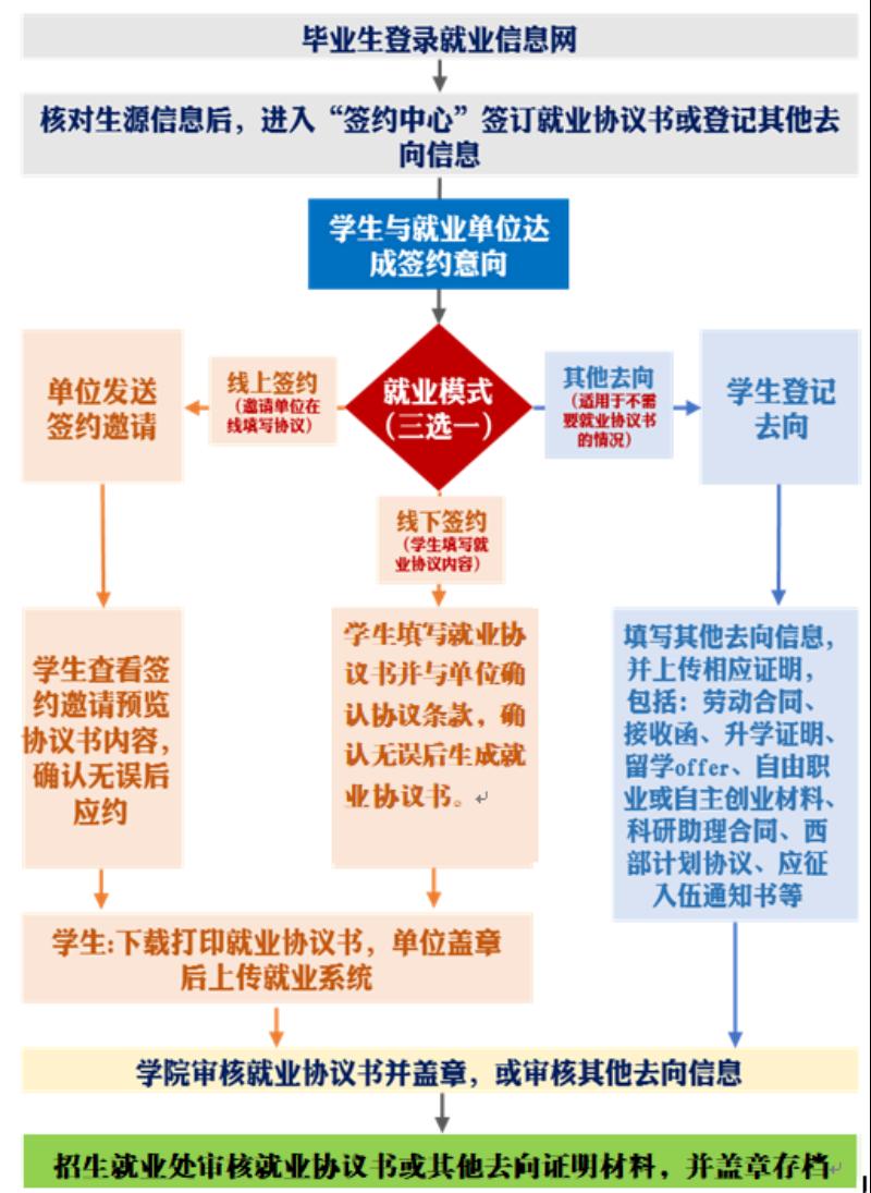 就业手续均通过就业系统完成,分成“线上签约”、“线下签约”和“其他去向登记”三种模式。学校不再发放纸质空白协议书。具体流程如下图: