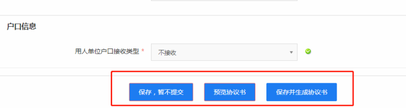 1.进入“线下签约”菜单,点击“录入协议书”,填写用人单位提供的协议书相关信息,包括单位联系方式、签约条款、户档信息等。确定信息无误后,点击“保存并生成协议书”。