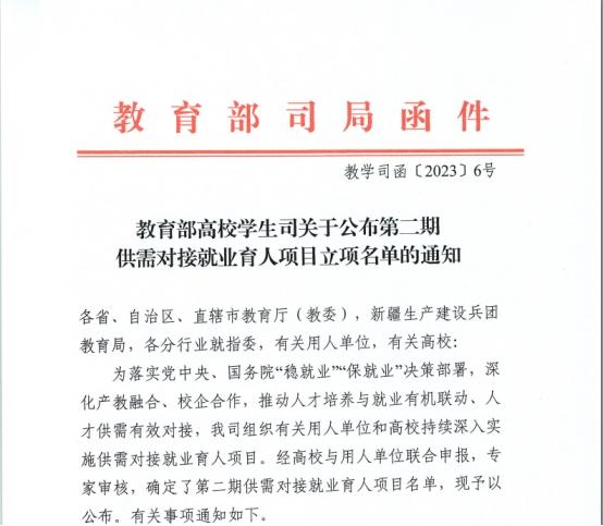 近日,教育部高校学生司发布了《关于公布2022年第二批供需对接就业育人项目立项名单的通知》(教高司函〔2023〕6号),我校共计5项供需对接就业育人项目成功入选。