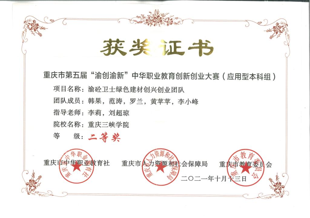 近日,重庆市第五届“渝创渝新”中华职业教育创新创业大赛决赛在重庆城市职业管理学院举行。我校《渝砼卫士绿色建材》项目团队通过校赛、市赛等环节层层选拔,最终斩获重庆赛区应用本科组二等奖。